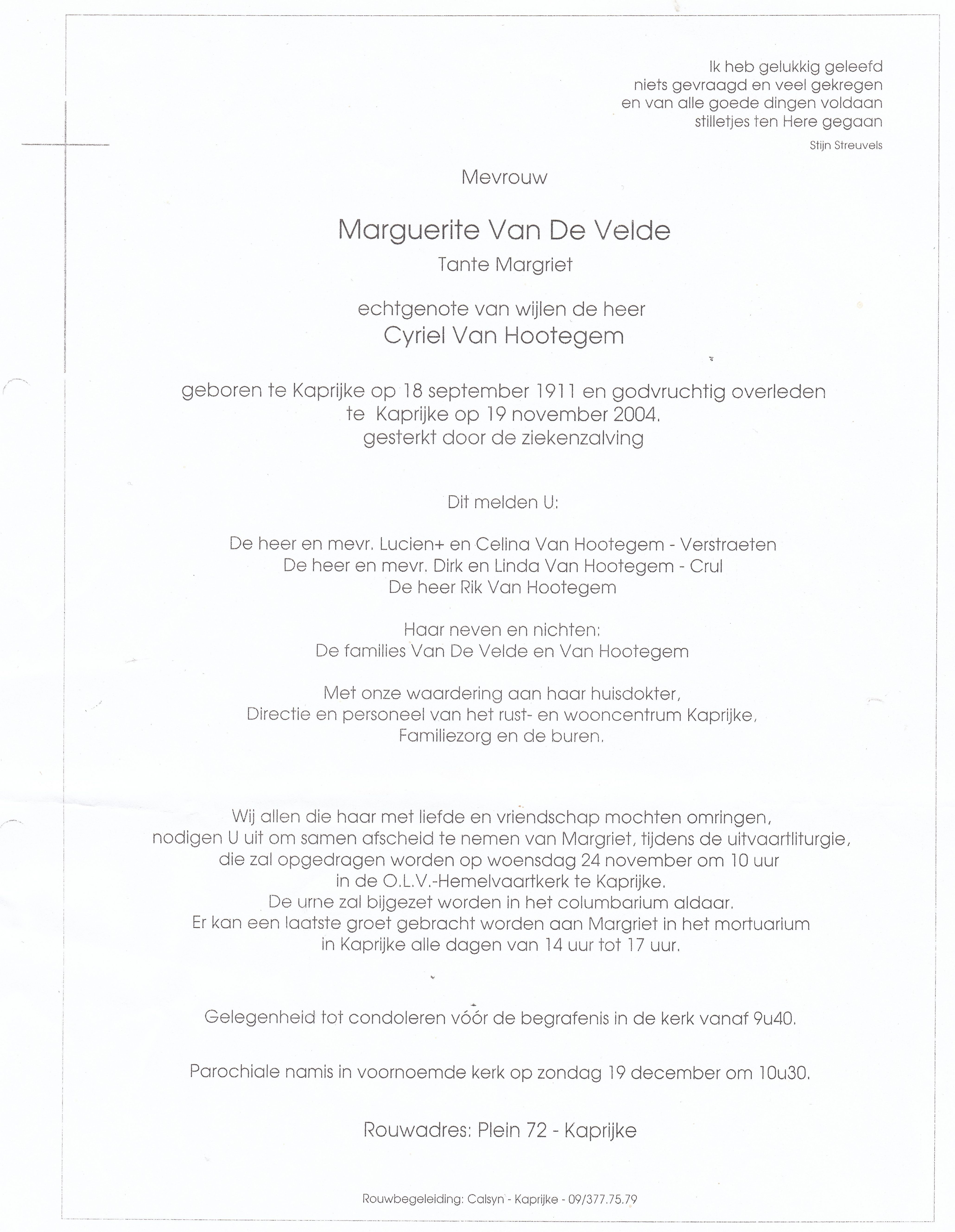 Van De Wijnckel, Alice (Watervliet 23/2/1921 - id 21/1/2002) w. Steyaert, Juliaan