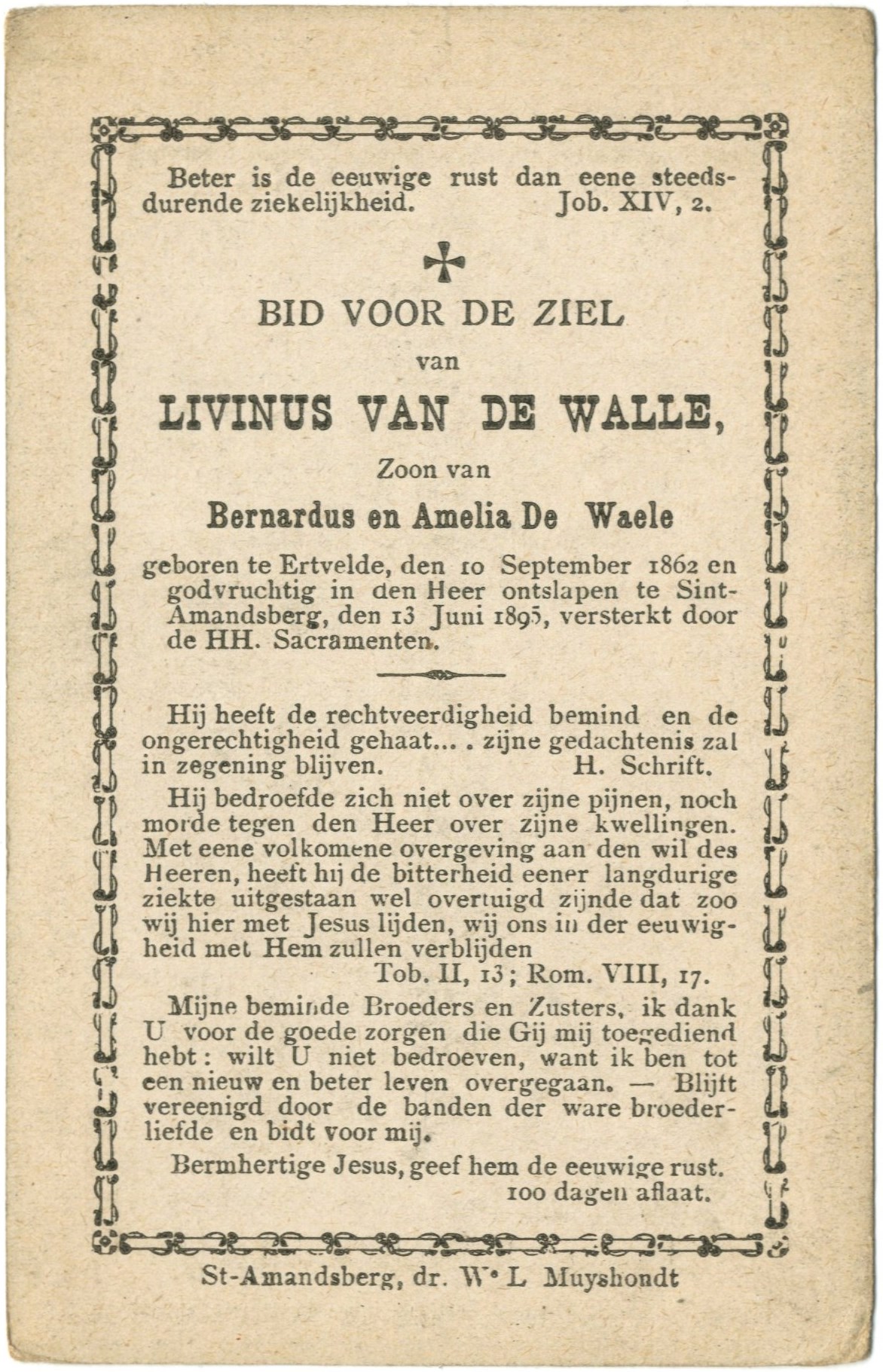 Van De Walle, Prudent (Ertvelde 7/6/1869 - Gentbrugge 20/7/1901) fs. Van De Walle, Bernardus en De Waele, Amelia