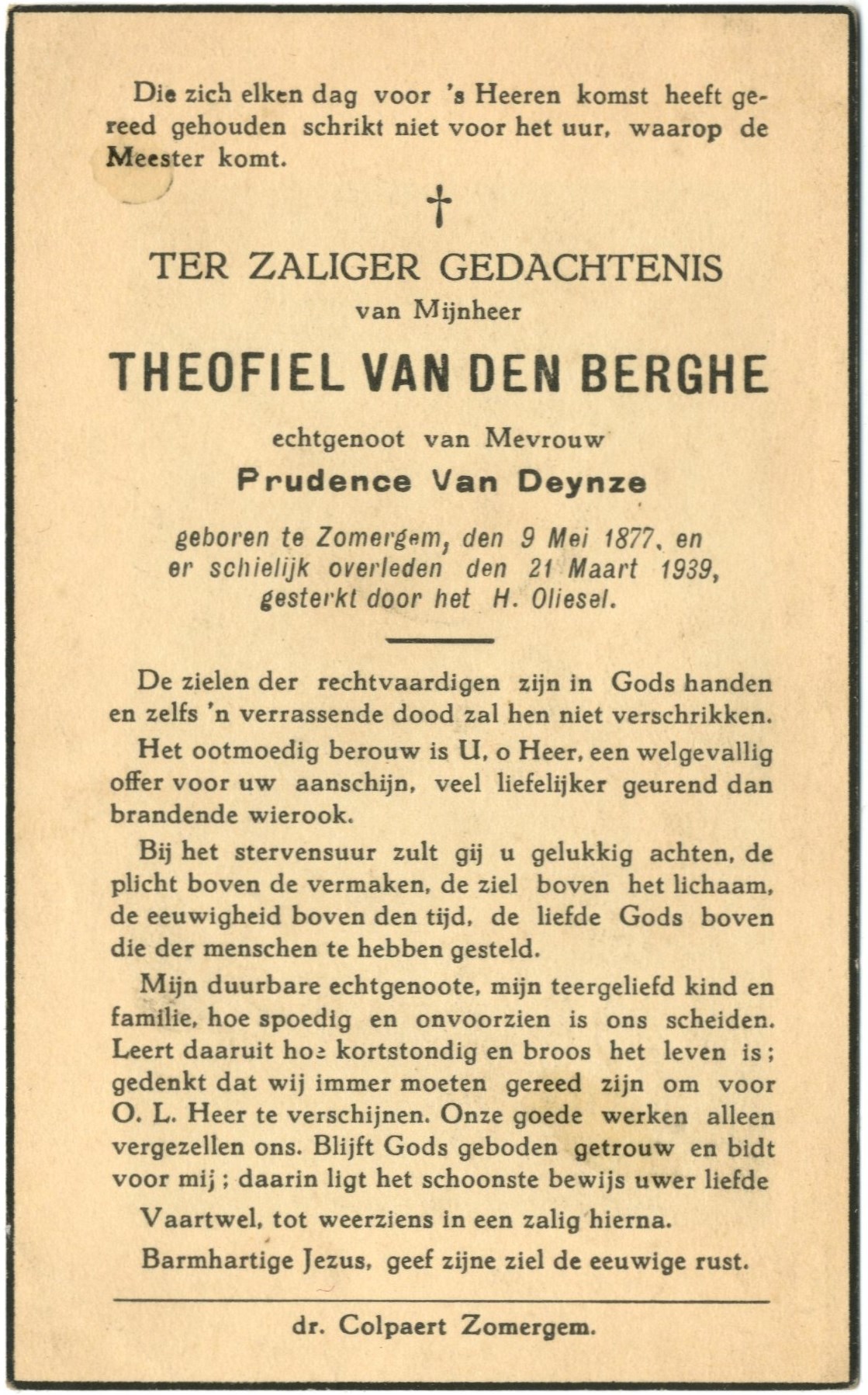 Van De Weghe, Oktaaf (Zomergem 5/12/1882 - id 9/1/1962) w. Tierentyn, Maria; e. Galens, Camilla
