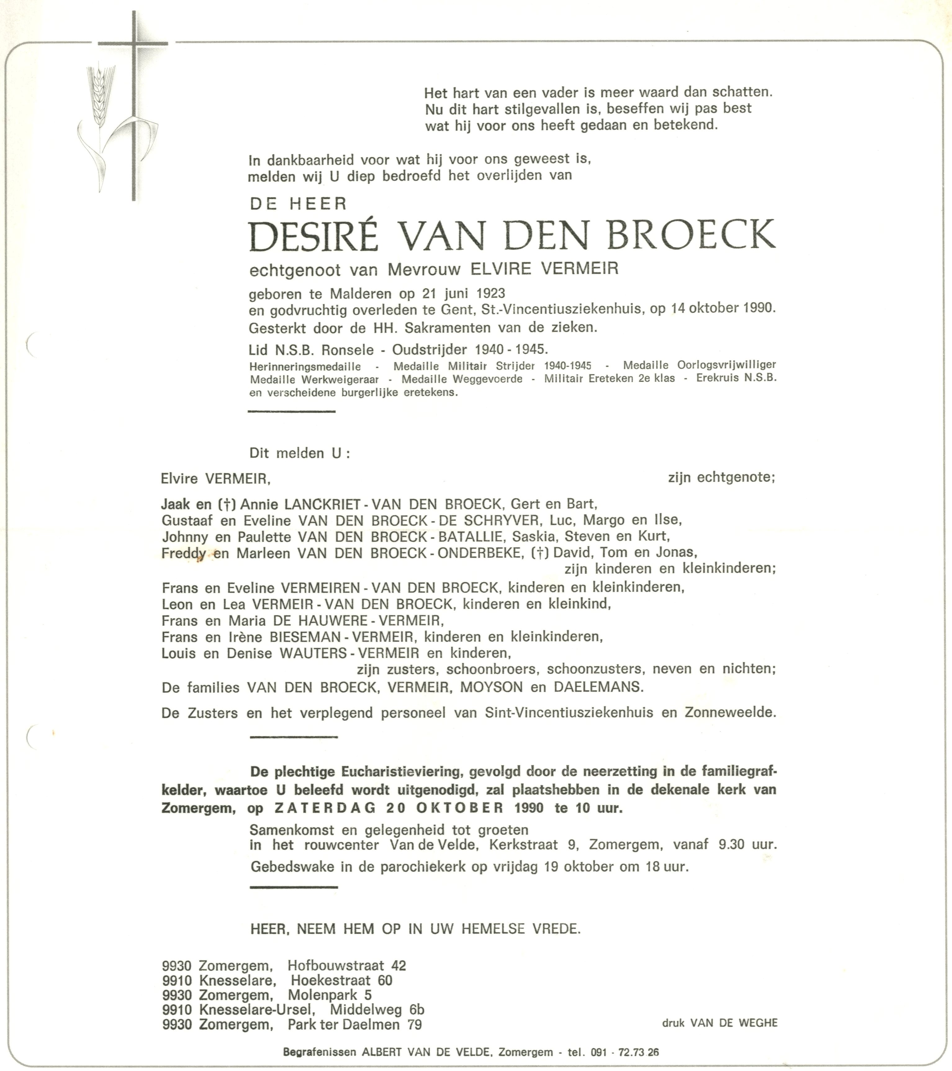 Van De Walle, René (Zomergem 22/4/1903 - Waarschoot 7/4/1977) w. De Coster, Martha; w. De Vuyst, Paula