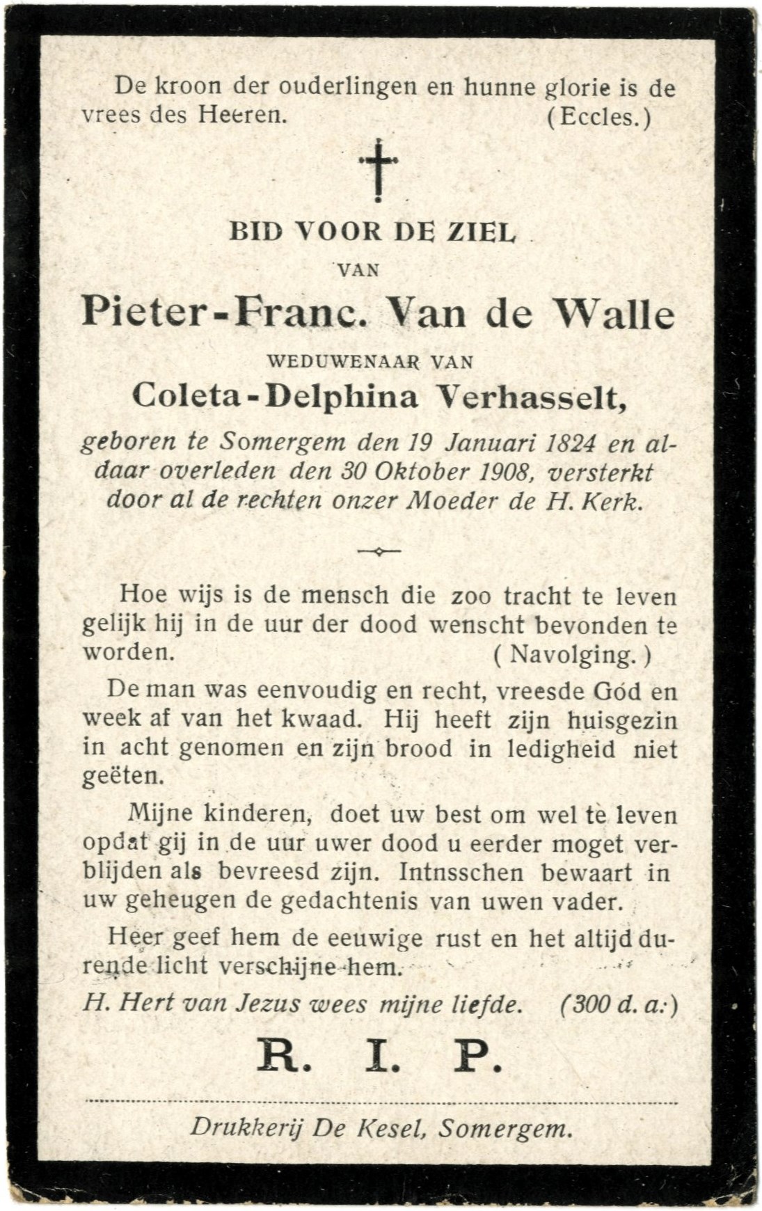 Van de Walle, Pieter-Franc. (Somergem 19/1/1824 - id 30/10/1908) w. Verhasselt, Coleta-Delphina