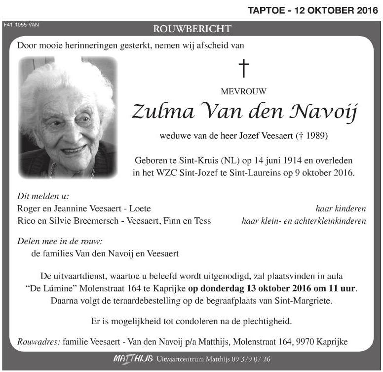 Van Assche, Zulma (Nazareth 31/12/1894) w. Van Hauwaert, Kamiel