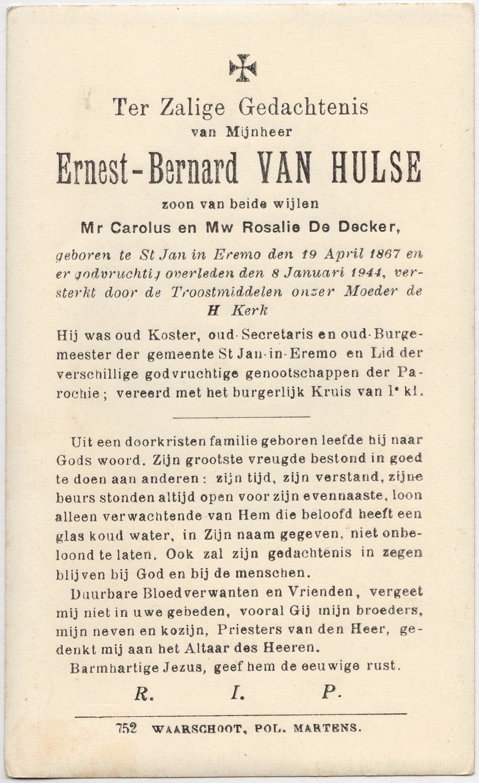 Van Zeveren, Ivo (Aerseele 11/8/1854 - Gent 22/2/1941) w. Arickx, Maria-Stephanie