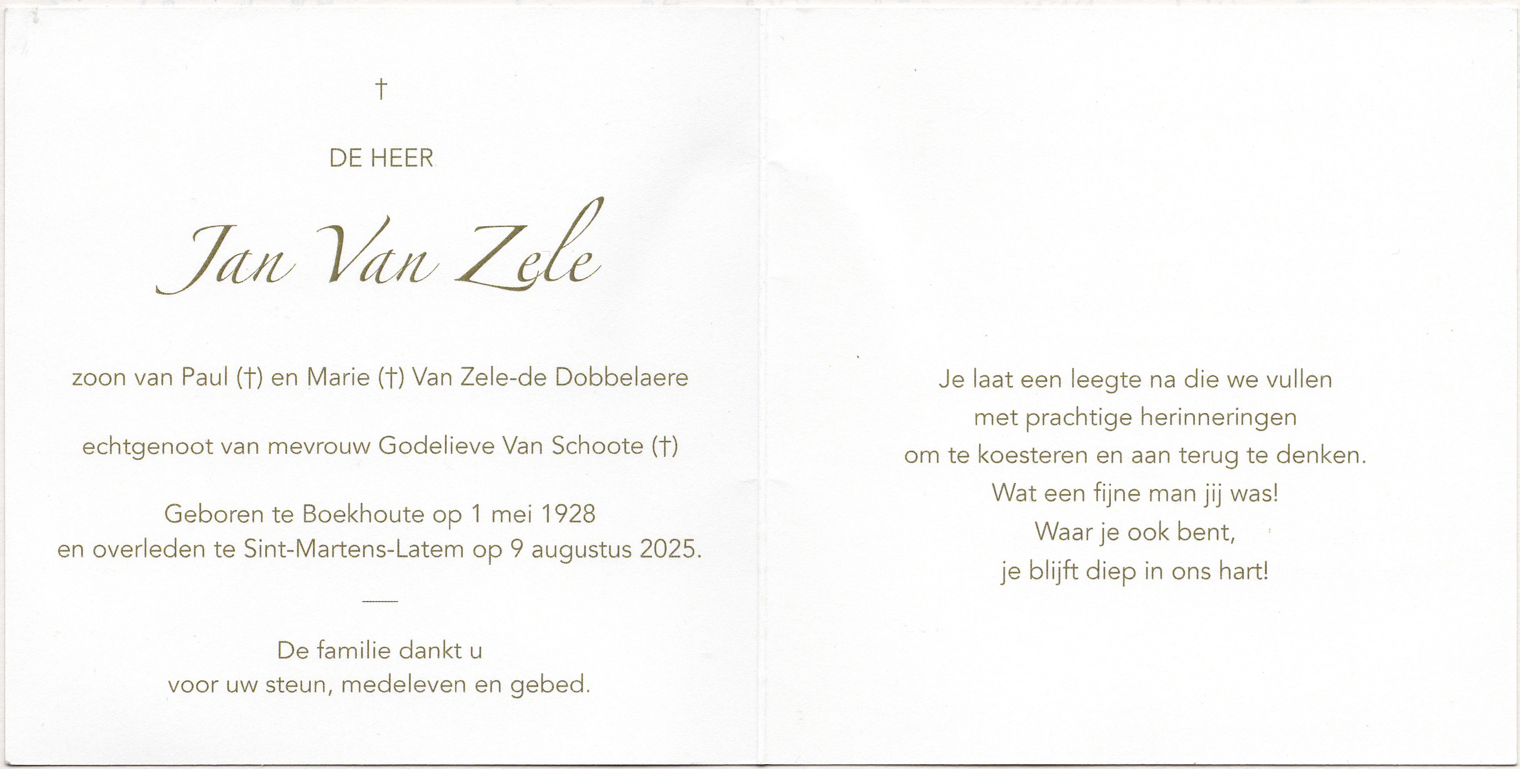 Van Zele, Jan (Boehoute 1/5/1928 - St-Martens-Latem 16/8/2025) w. Van Schoote, Godelieve