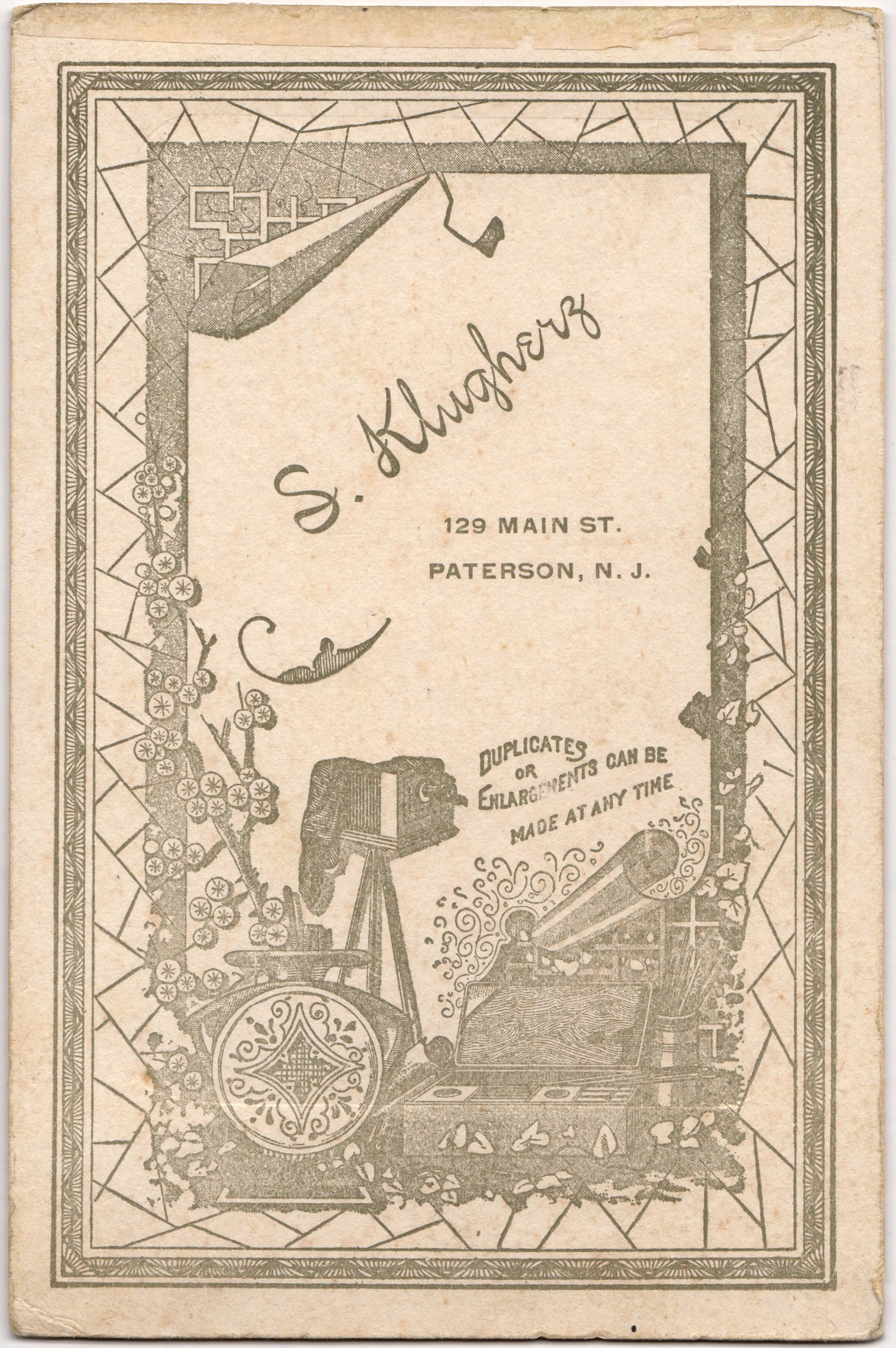 Dit is een foto van «S. Klugherz, 129 Main St., Paterson, N.J.».