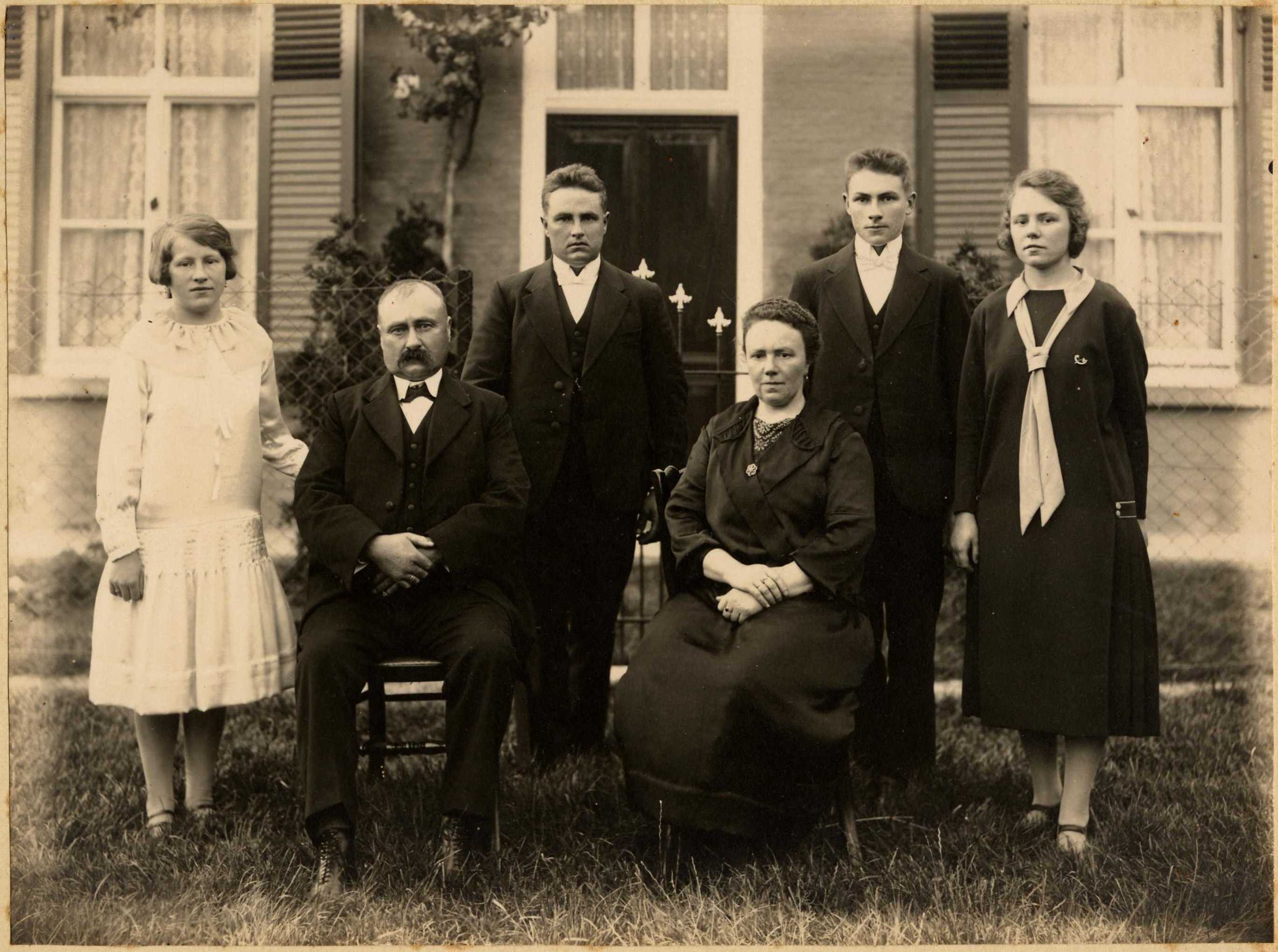Vlnr: Celina, Camile, François, Louise, Charles en Marie. Camile Marie Joseph Temmerman werd geboren in IJzendijke op 10 maart 1874. Louisa Maria Haverbeke werd geboren in IJzendijke op 20 april 1879. Ze zijn er gehuwd op 14 mei 1901. Ze boerden er op hoeve het Pannenhuis in de Oranjepolder tot 1940. Ze zijn er ook allebei overleden, hij op 11 oktober 1943 en zij op 19 juni 1956. Marie Temmerman werd op 6 juli 1926 de echtgenote van Charles Van Damme en deze foto werd op die dag gemaakt op de hoeve. Hier vindt u een grotere versie van deze foto. Hun huwelijksfoto werd hier ook gemaakt. François is vroeg gestorven. Hier vindt u zijn bidprentje en hier vindt u een foto van zijn weduwe en hun kinderen. |