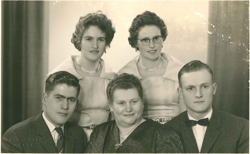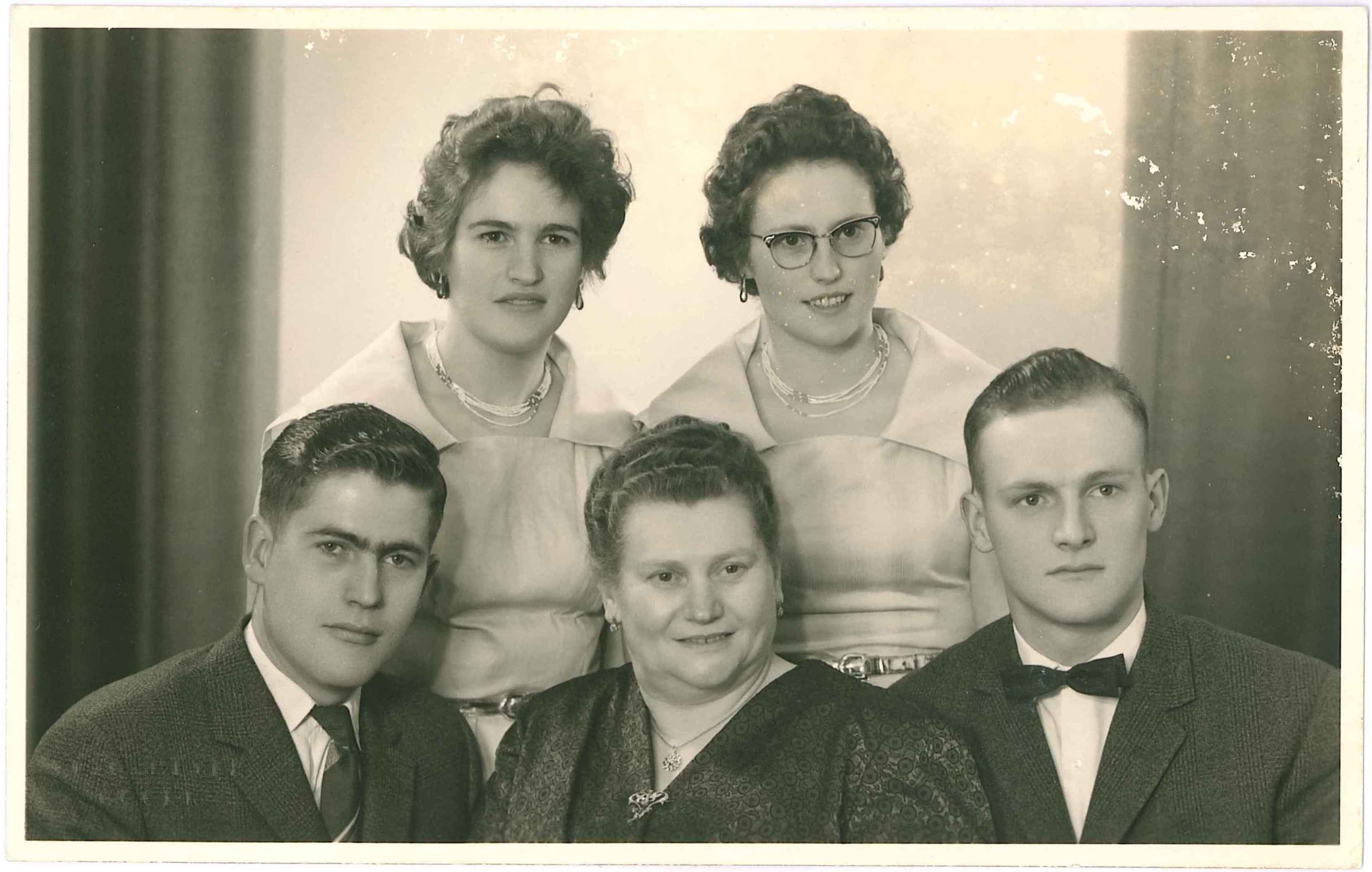 | François Temmerman (geboren op 6/2/1902) stierf op 7/12/1955. Hier zien we zijn weduwe, Marie Sturm en hun kinderen. Hortensia Clementina Sturm was Marie's tante. Als u uw kurseur even op een hoofd laat rusten, zou een naam moeten verschijnen. Hier is een grotere versie van deze foto. |