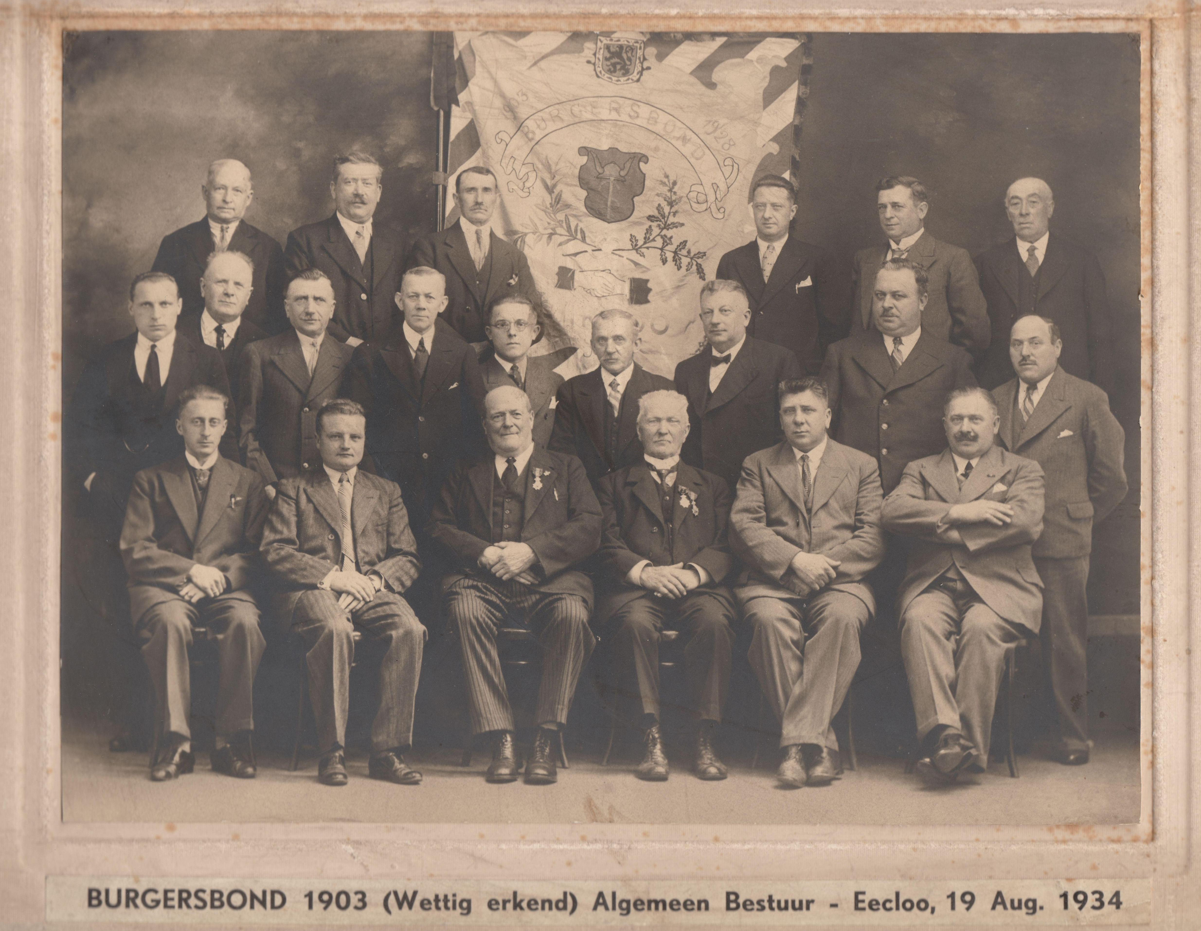 ![]() Onder de volledige foto (hier) van "A. Smitz & Zoon" staat: "Burgersbond 1903 (Wettig erkend) Algemeen Bestuur - Eecloo, 19 Aug. 1934" Wie zijn al die respectabele heren ? Weet u meer over deze "Burgersbond" ? Neem dan aub contact op met ons. |