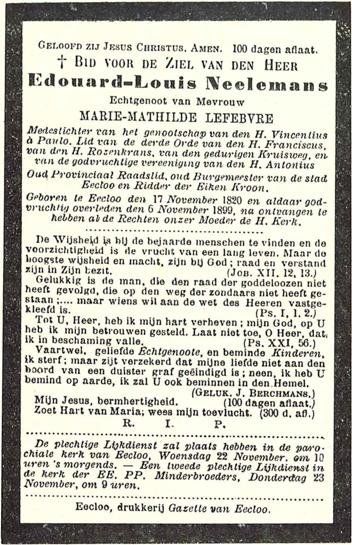 Op 8 februari 1882 werd Eduard Neelemans tot burgemeester van Eeklo benoemd.