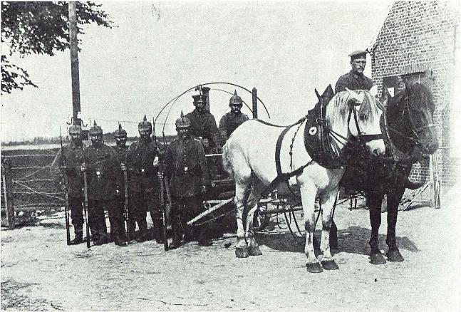 | 34. Duitse grenswachters en leden van de bevoorradingsdienst bij de grenspost de Posthoorn te Boekhoute, in 1915. |