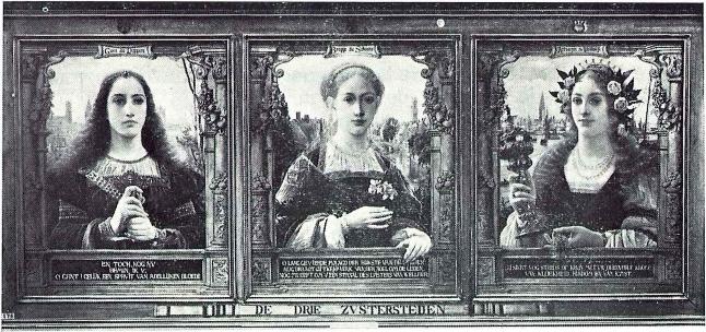 De drie panelen van «De Drie Zustersteden», door Edmond Van Hove (1898). |