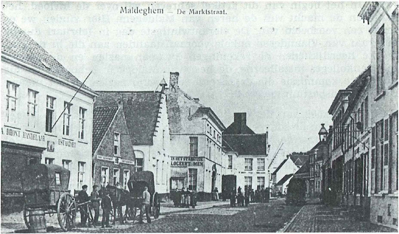 | De Marktstraat met ondermeer "Den Ossenkop-estaminet", verder "In het Stadhuis". |