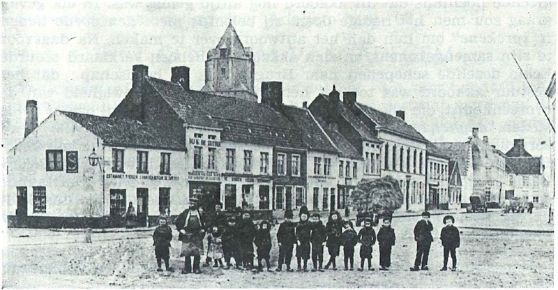 | Links op de hoek estaminet «'t Steen» bij J. Van Den Berghe-De Zutter. De derde woning is "De Gouden Leeuw estaminet". |
