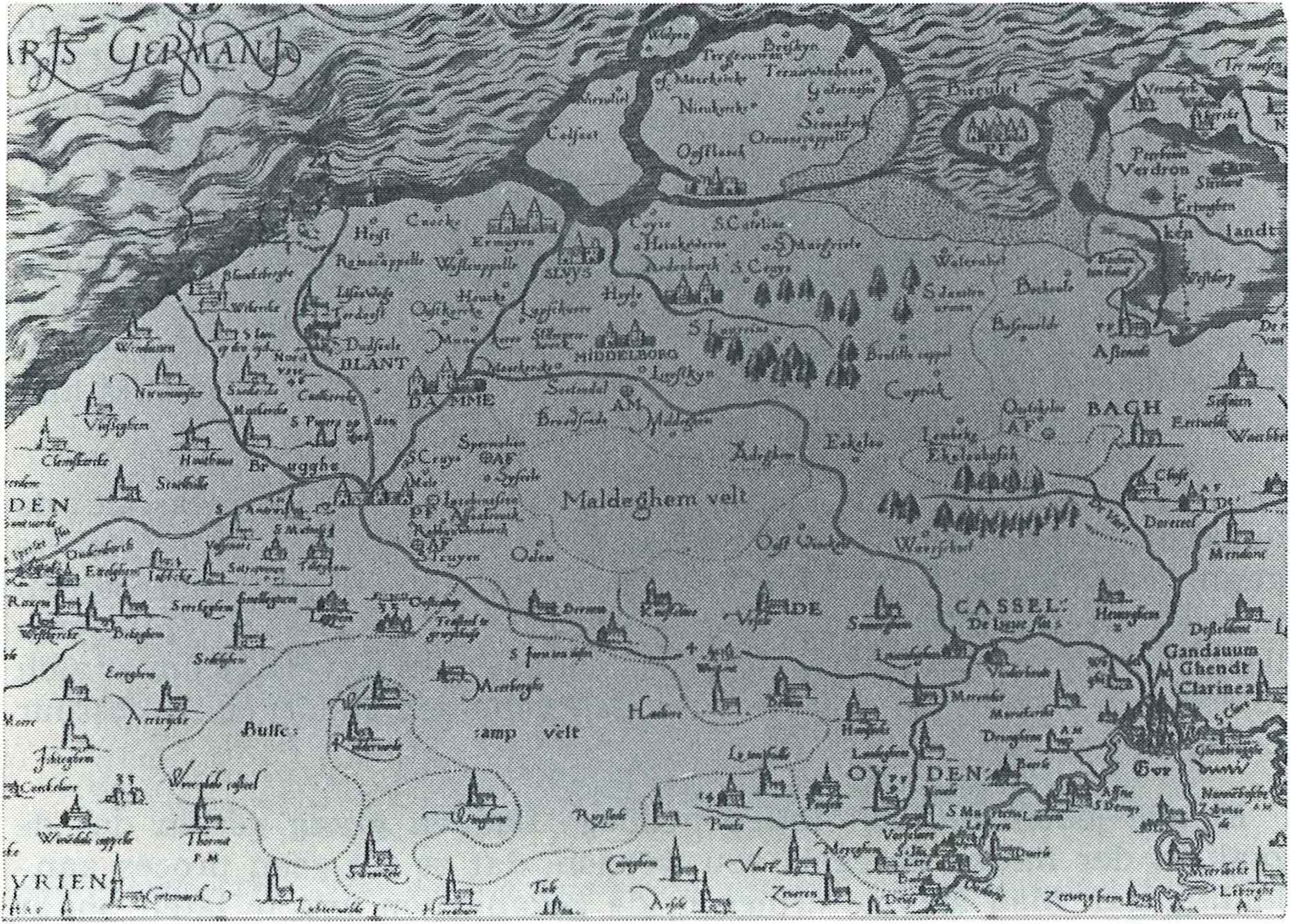 Gedeelte van de kaart Mercator. Het "Maldeghem velt"