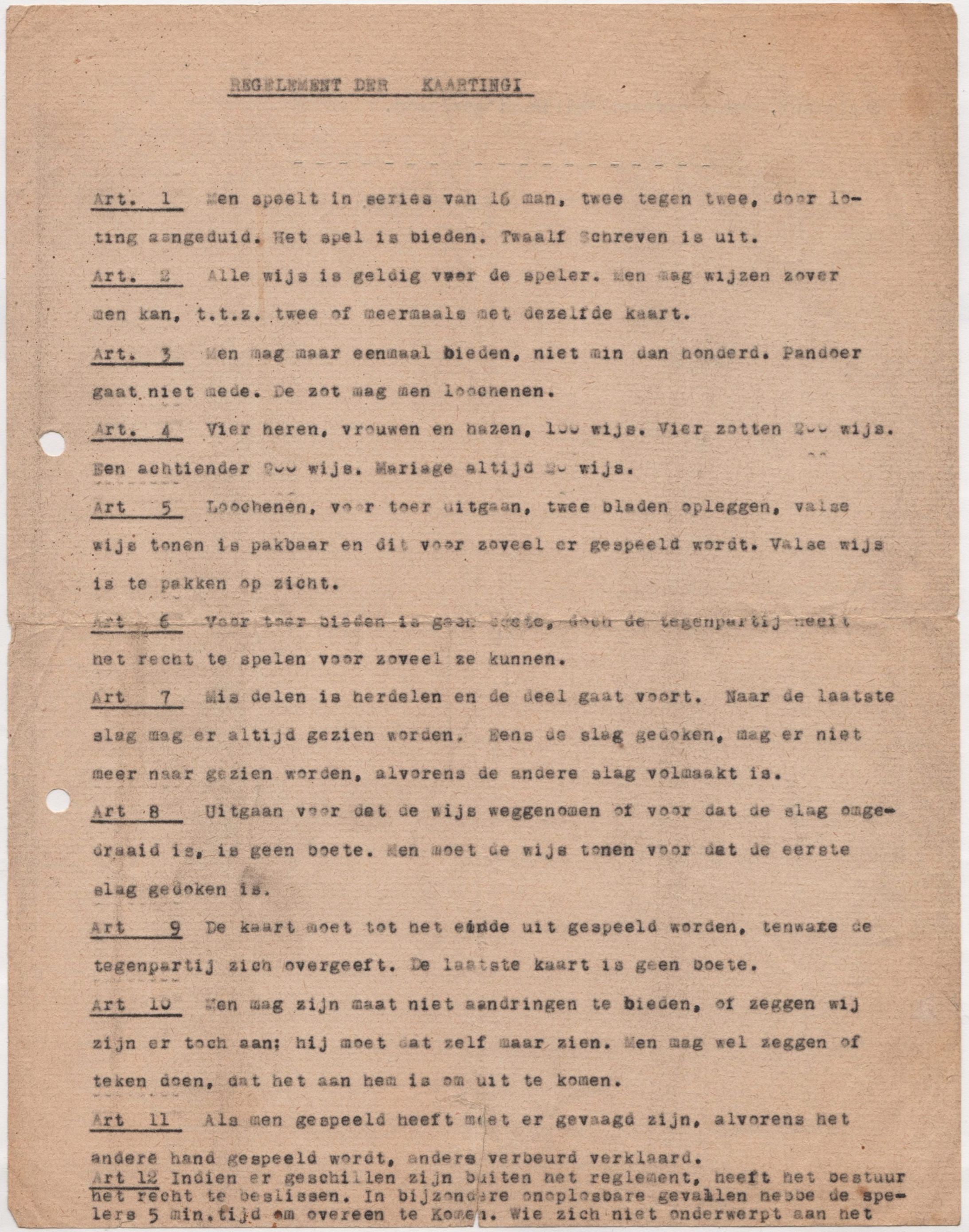 Art. 1 Men speelt in series van 16 man, twee tegen twee, door loting aangeduid. Het spel is bieden. Twaalf Schreven is uit.